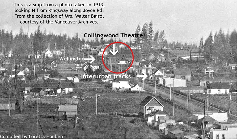 The theatre was near Wellington Avenue and Joyce Street, and by looking at another image (photo 3), I have deduced that this picture shows a view of Wellington and Joyce that was taken in 1913 and is from the collection of Mrs. Walter S. Baird, courtesy of the Vancouver Archives. If it weren’t for Mrs. Baird, we wouldn’t have any scenes of Joyce Road from the 1910 era. You can see a house on the left side of the photo that stood beside the theatre. I assume it was built in 1913 as it appears in the 1913 photo, and it appears in the directories the following year.