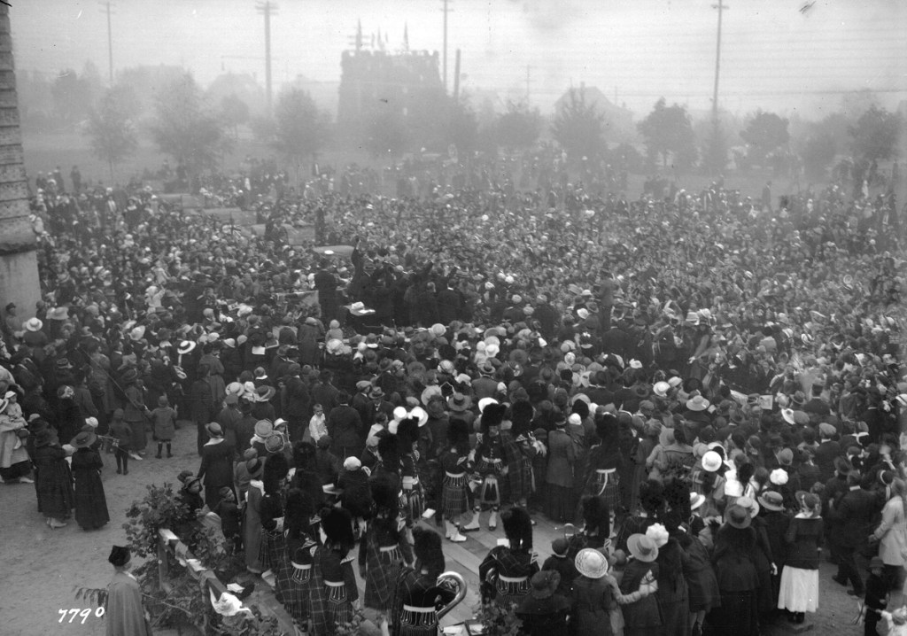 A large crowd gathered to hear HRH Prince of Wales fills Carleton’s school grounds. Photo from Vancouver Archives